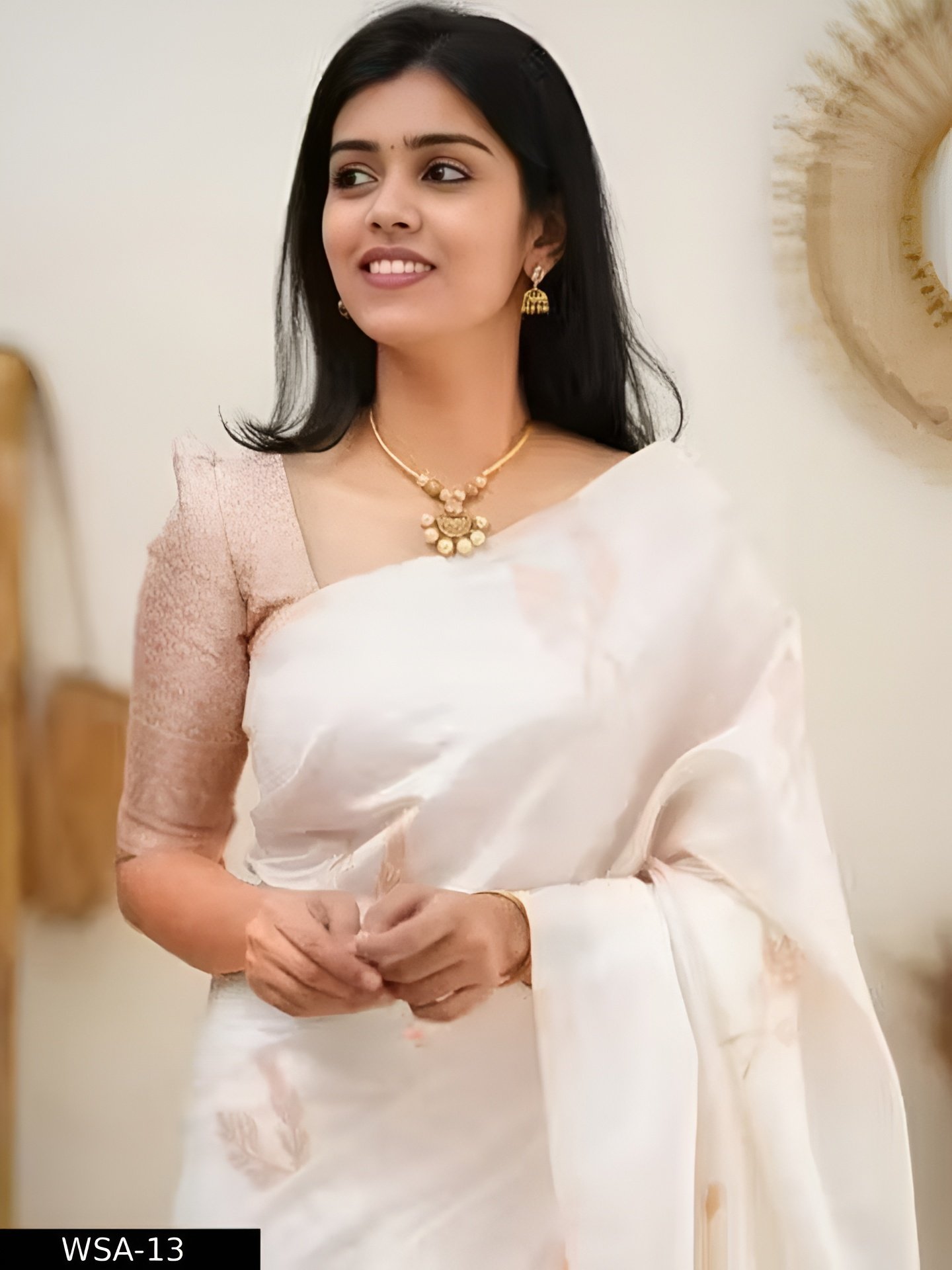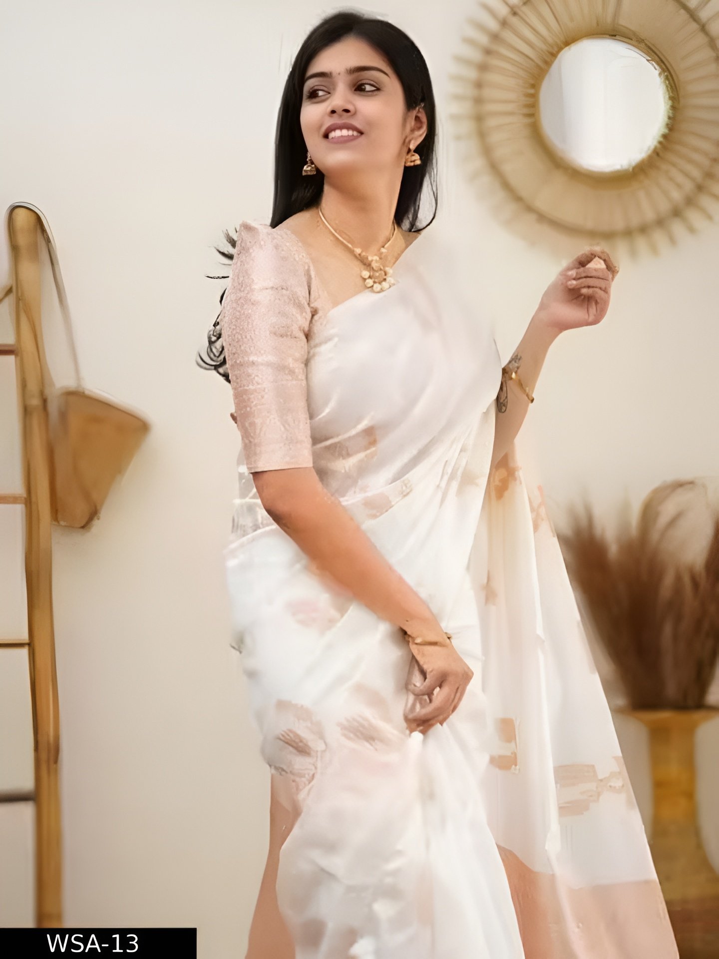 Elegant white and gold Banarasi soft silk saree crafted from premium litchi silk jacquard, offering a luxurious drape and timeless appeal for traditional and festive wear.