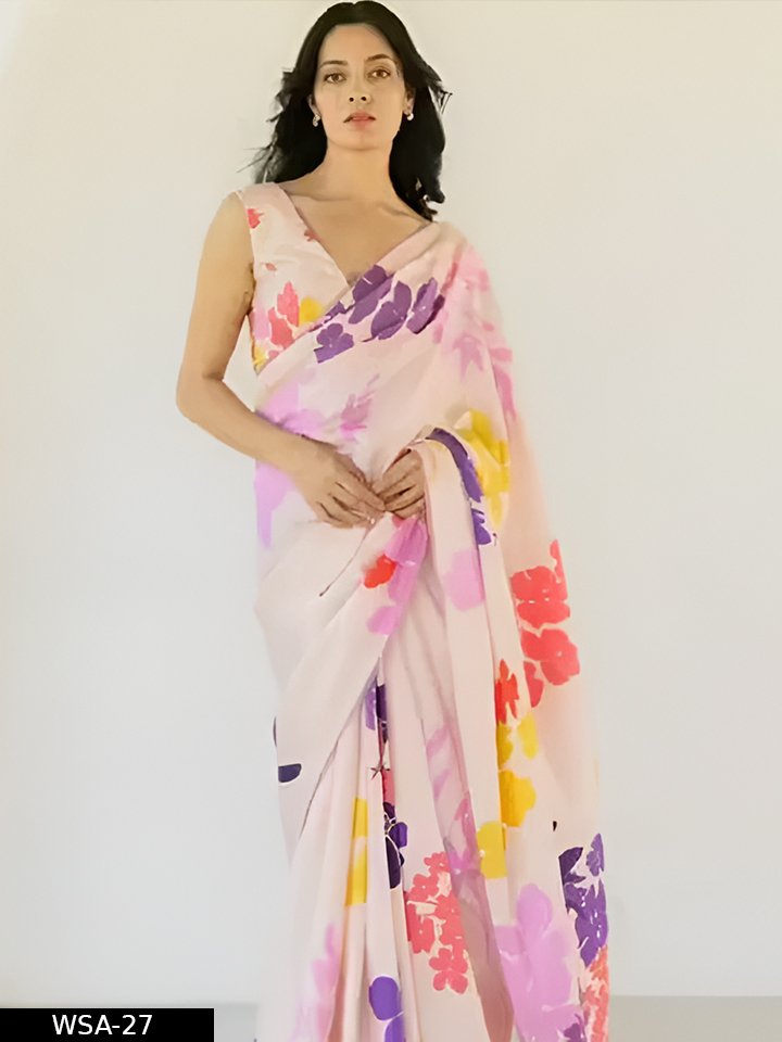 Description: Get ready to turn heads with this vibrant printed chiffon saree! The saree features a beautiful digital print and comes with a running blouse piece in matching chiffon fabric. Perfect for parties, festive occasions, or even daily wear, this saree is both elegant and comfortable. Unleash your inner diva with this stunning piece that offers long-lasting color durability and a latest design.