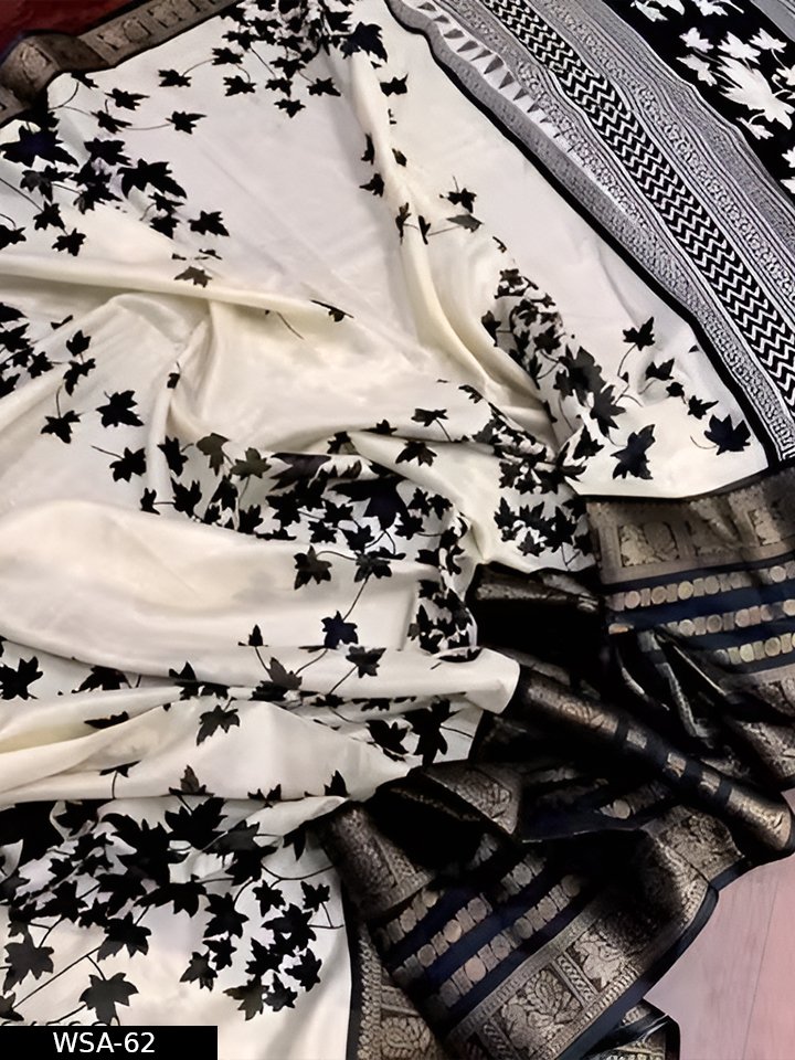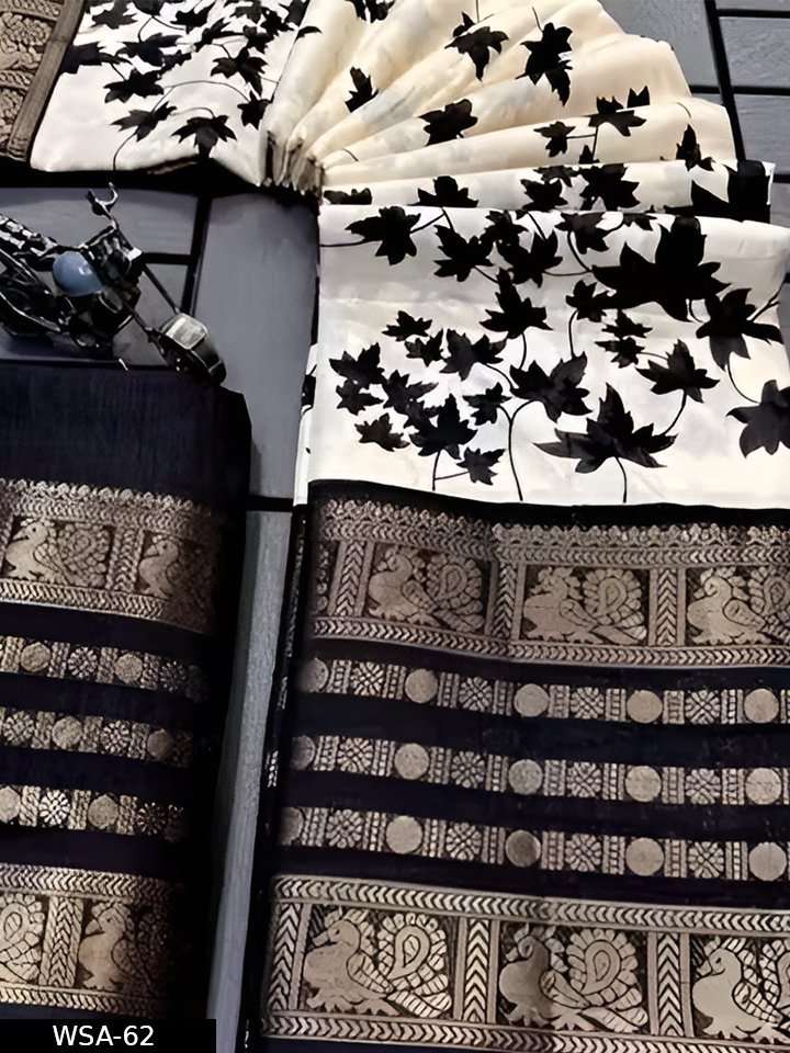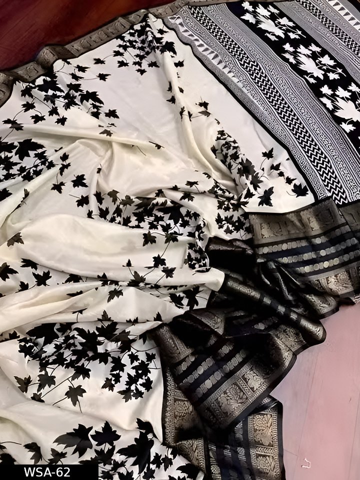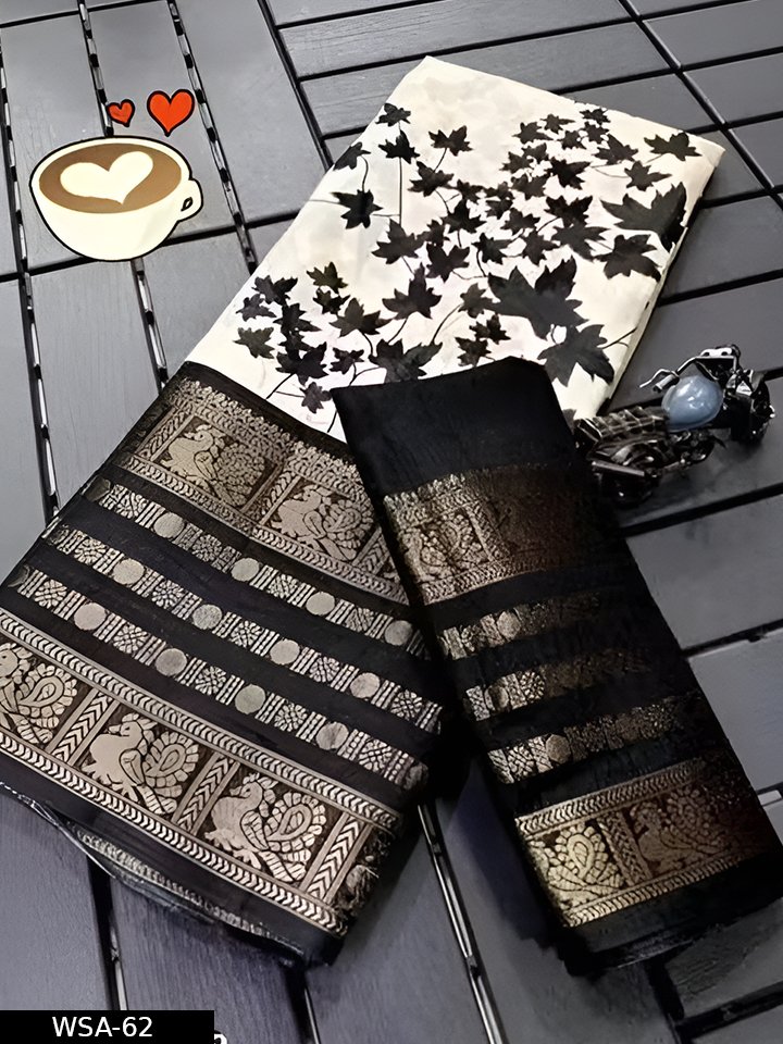 Description: Elegant Dola silk saree featuring a stylish printed design with a matching border blouse. Soft, smooth texture makes it comfortable for daily wear as well as casual occasions.