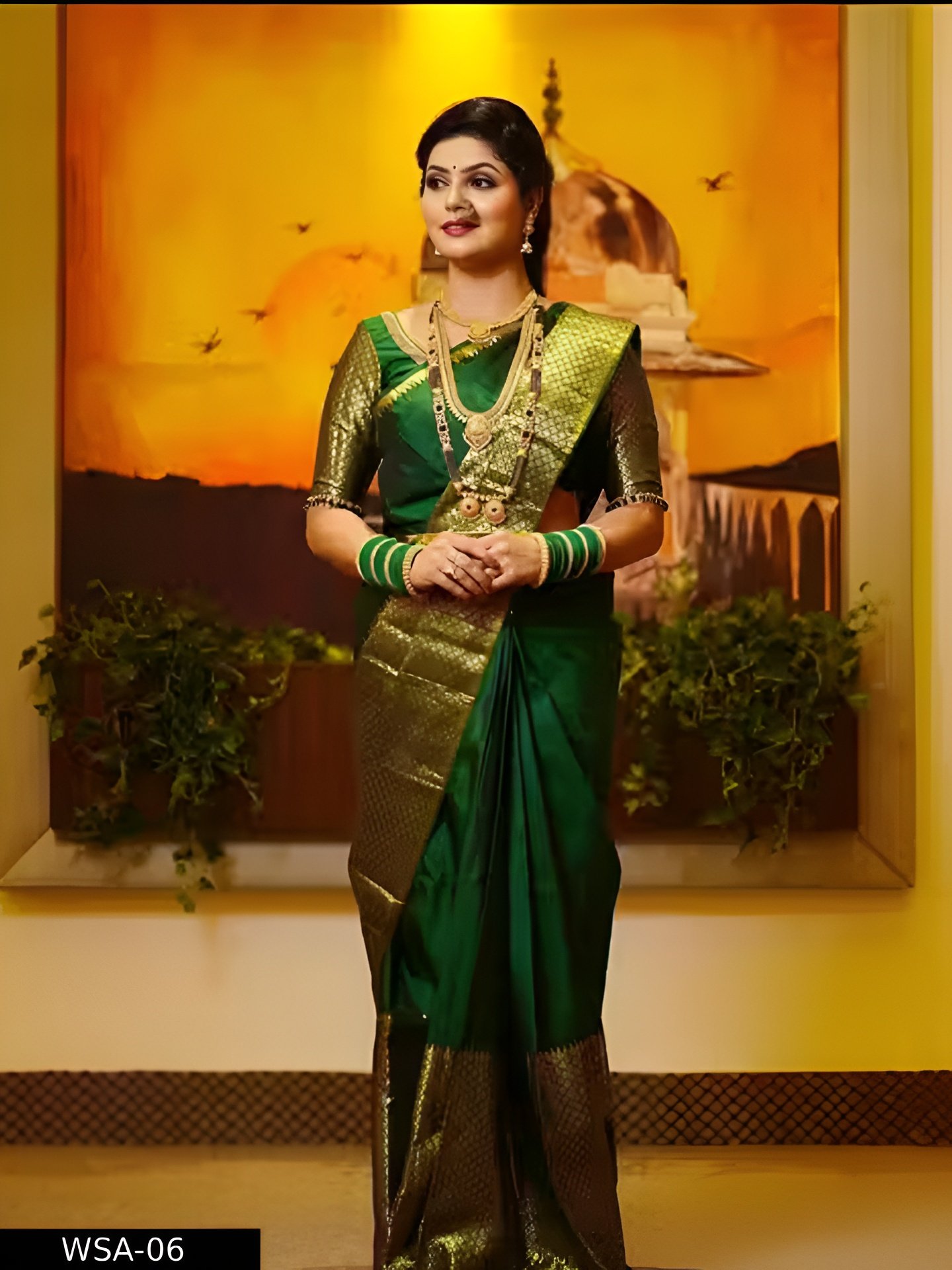 Name : Bottle Green Soft Lichi Silk Saree Woven with Gold Zari with Unstitched Running Blouse