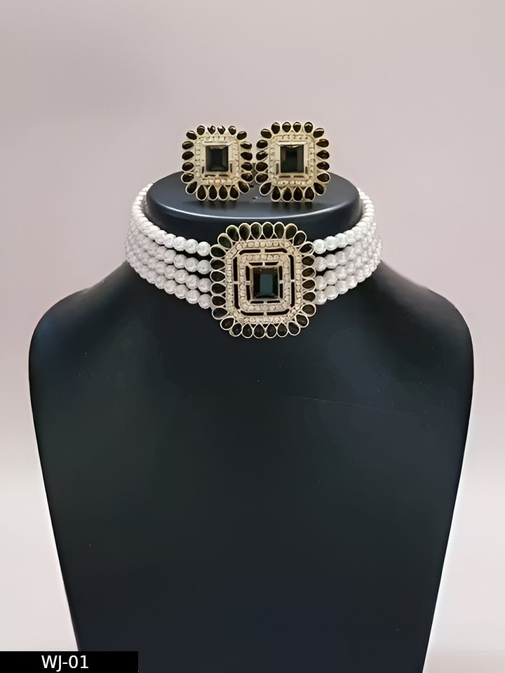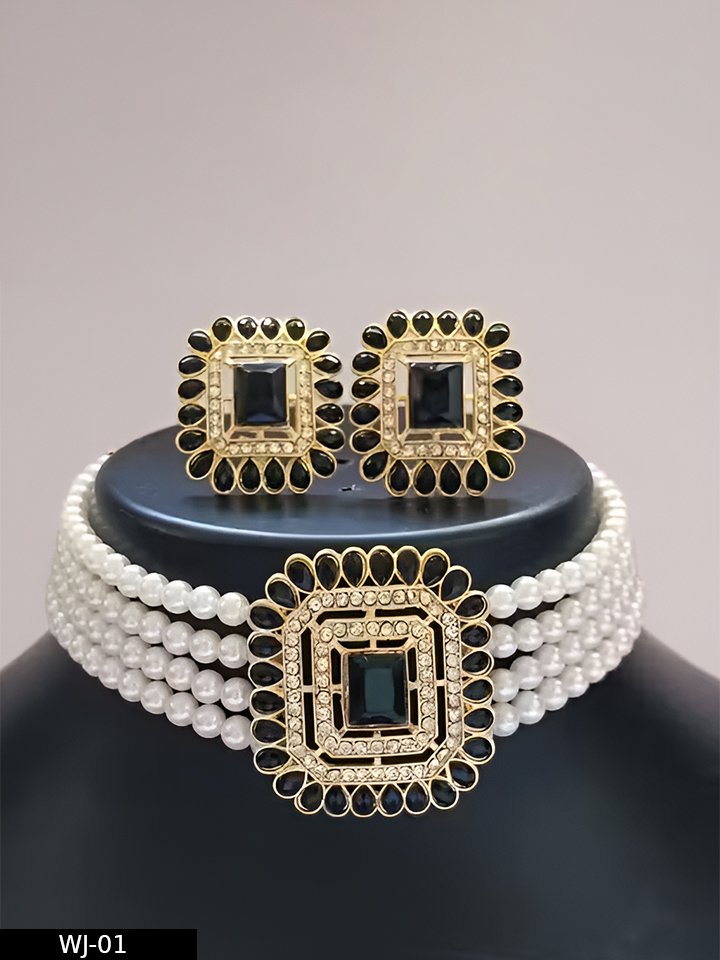 Design: Beautiful 3-layer pearl choker with matching square-shaped earrings