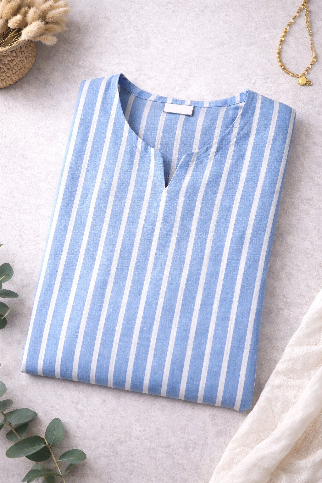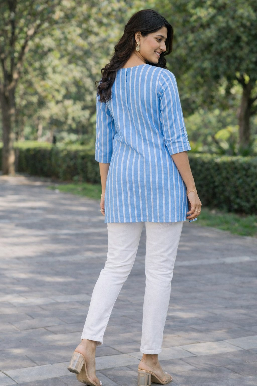 Women’s Sky Blue Striped Cotton Short Kurti with 3/4 Sleeves